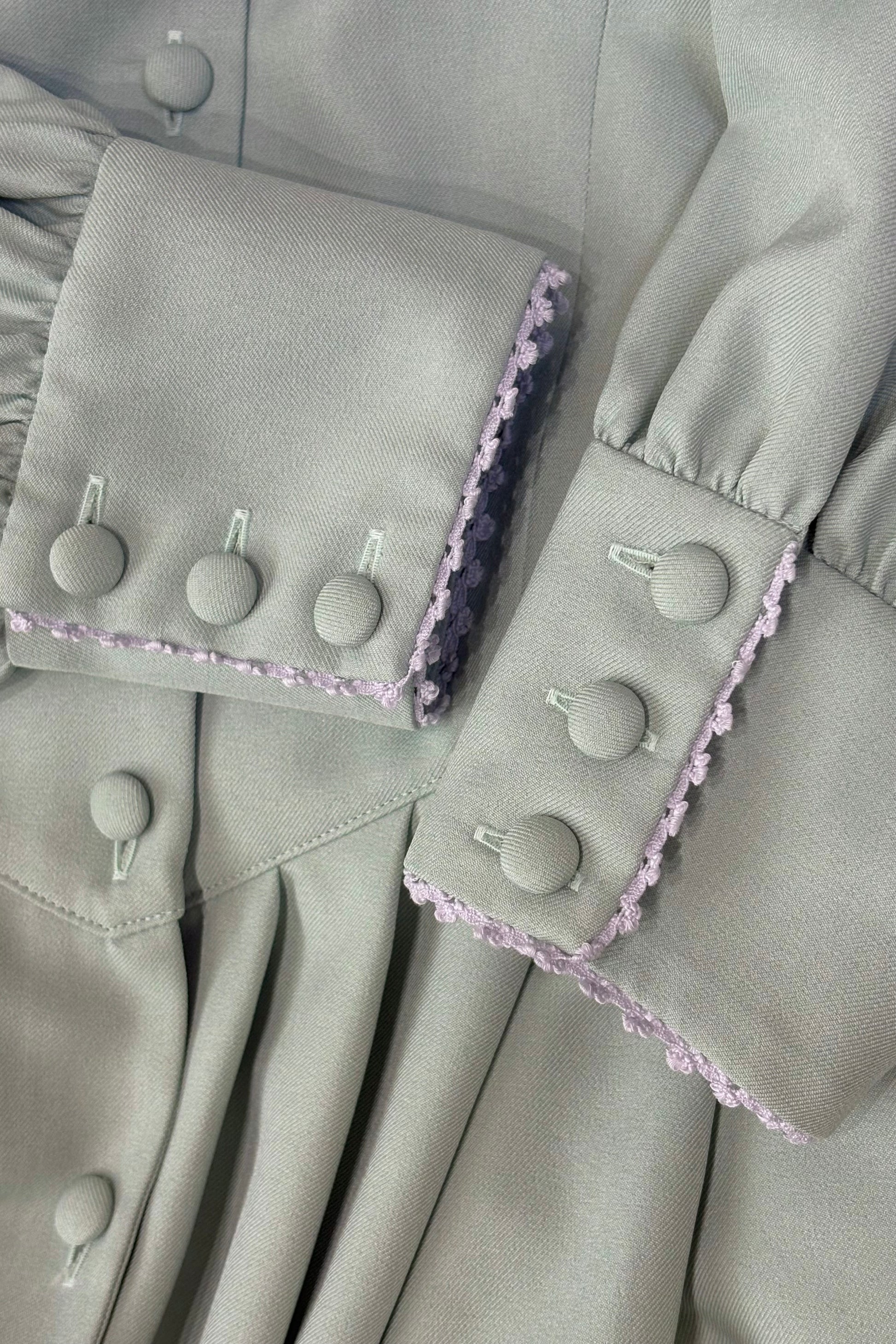 花びらのように広がる美しいシルエットと、可憐なビオラの刺繍をあしらった襟が印象的なFleur dress-viola(フルールドレス-ビオラ)