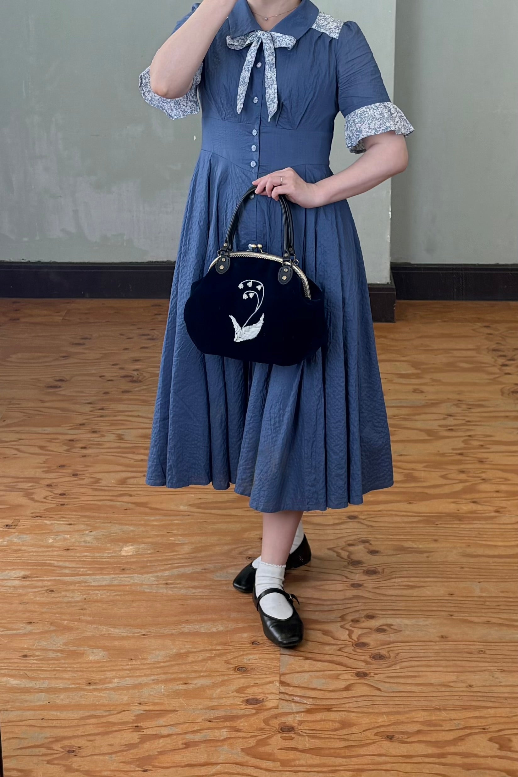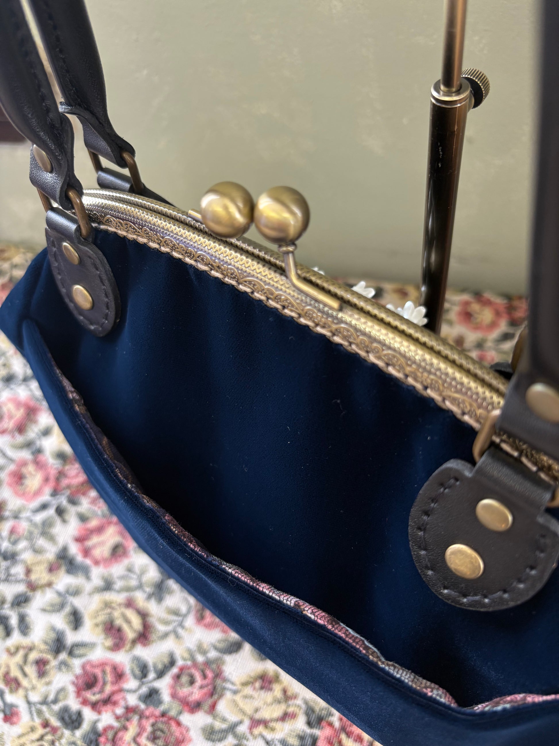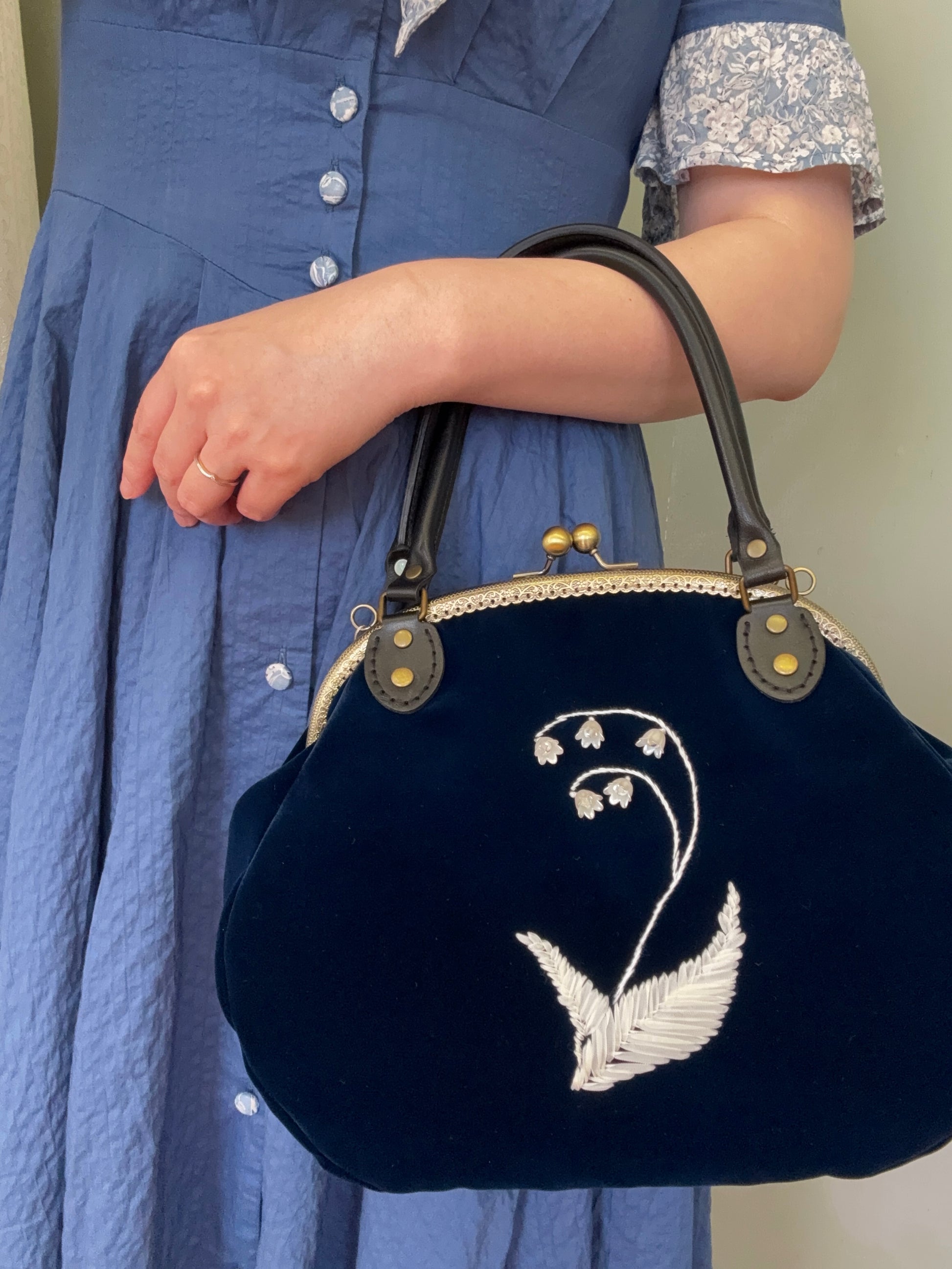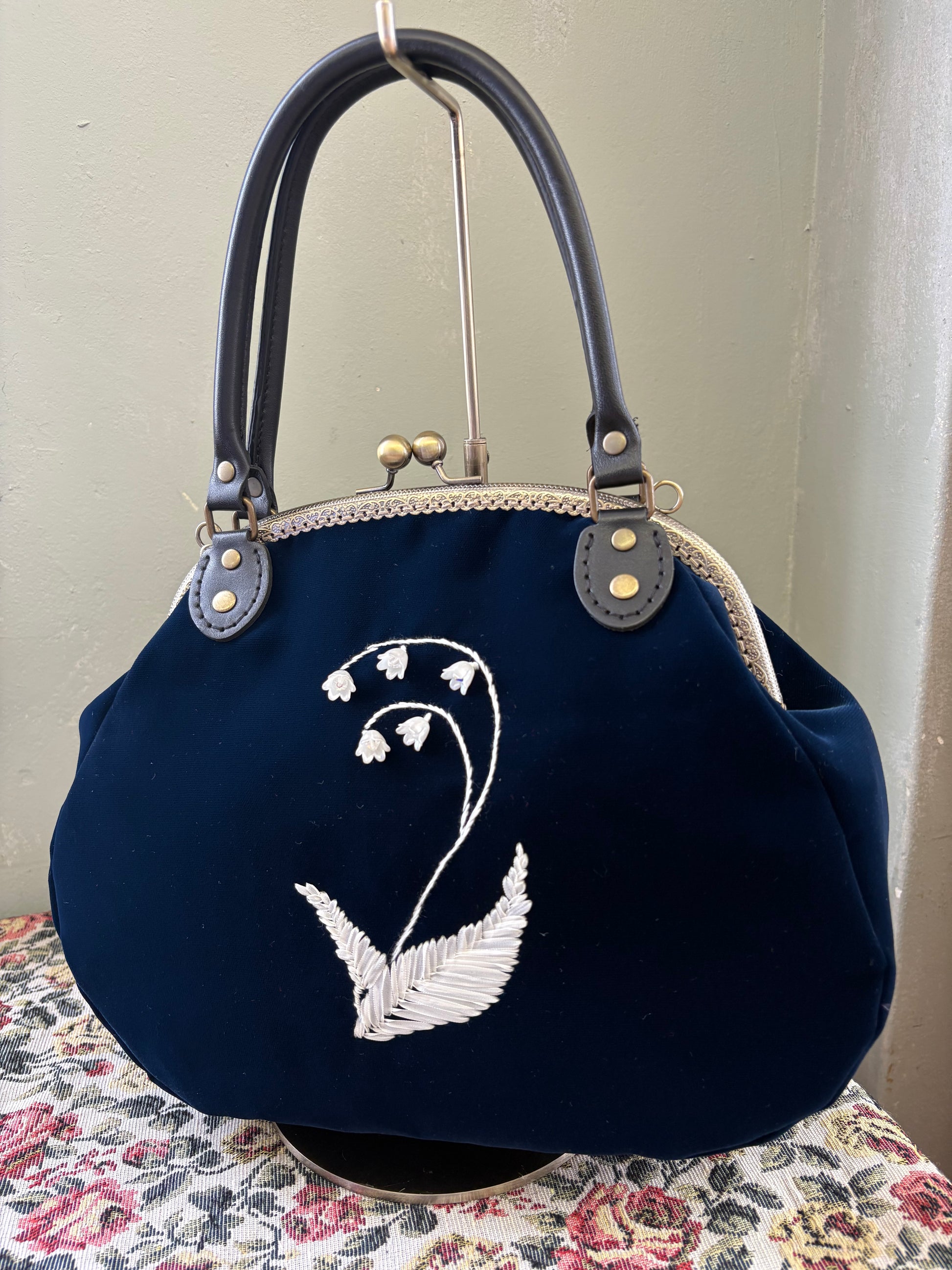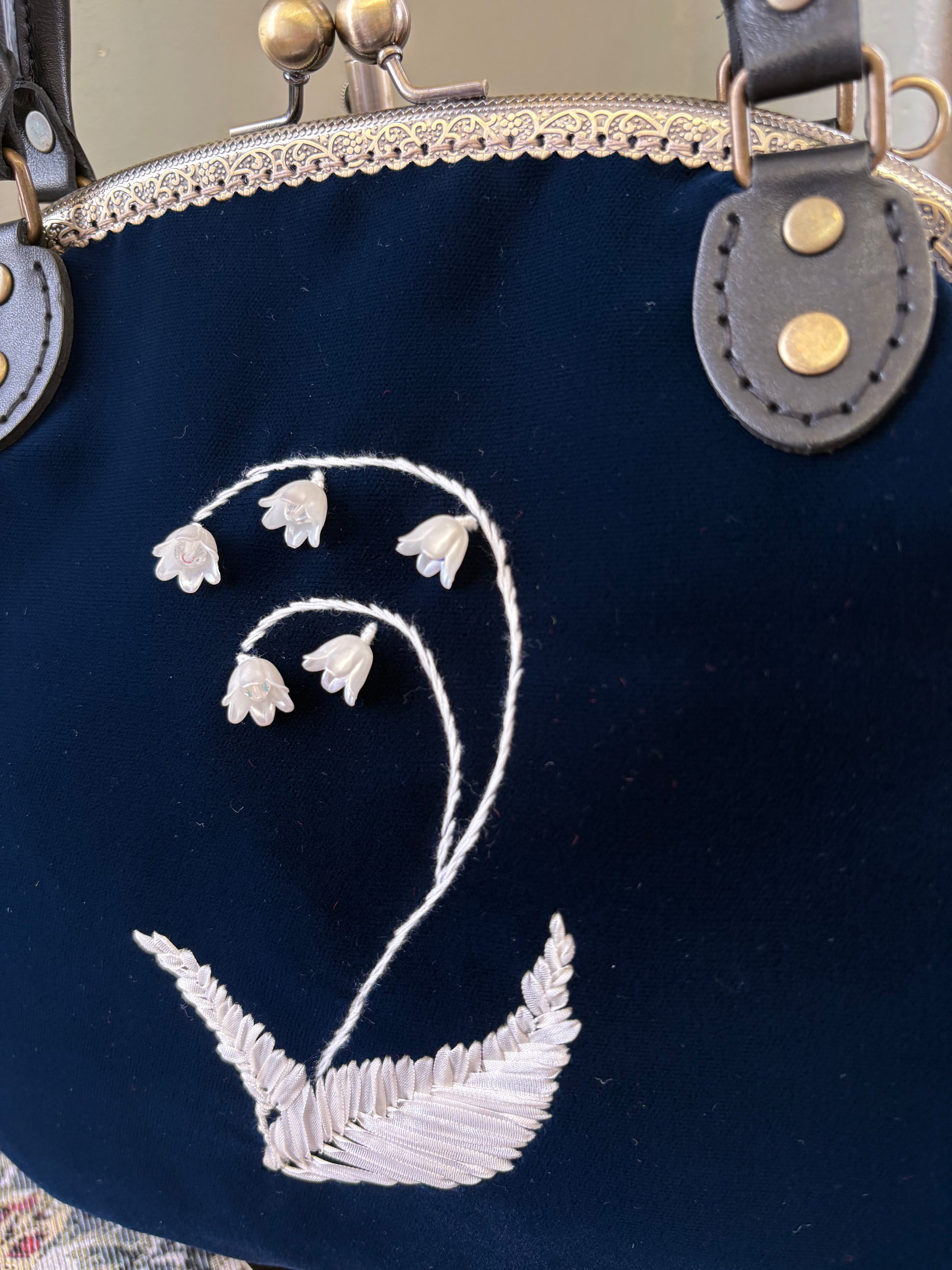navy 鈴蘭のモチーフをビーズとリボン刺繡で立体的にあしらった深いネイビーのバッグ