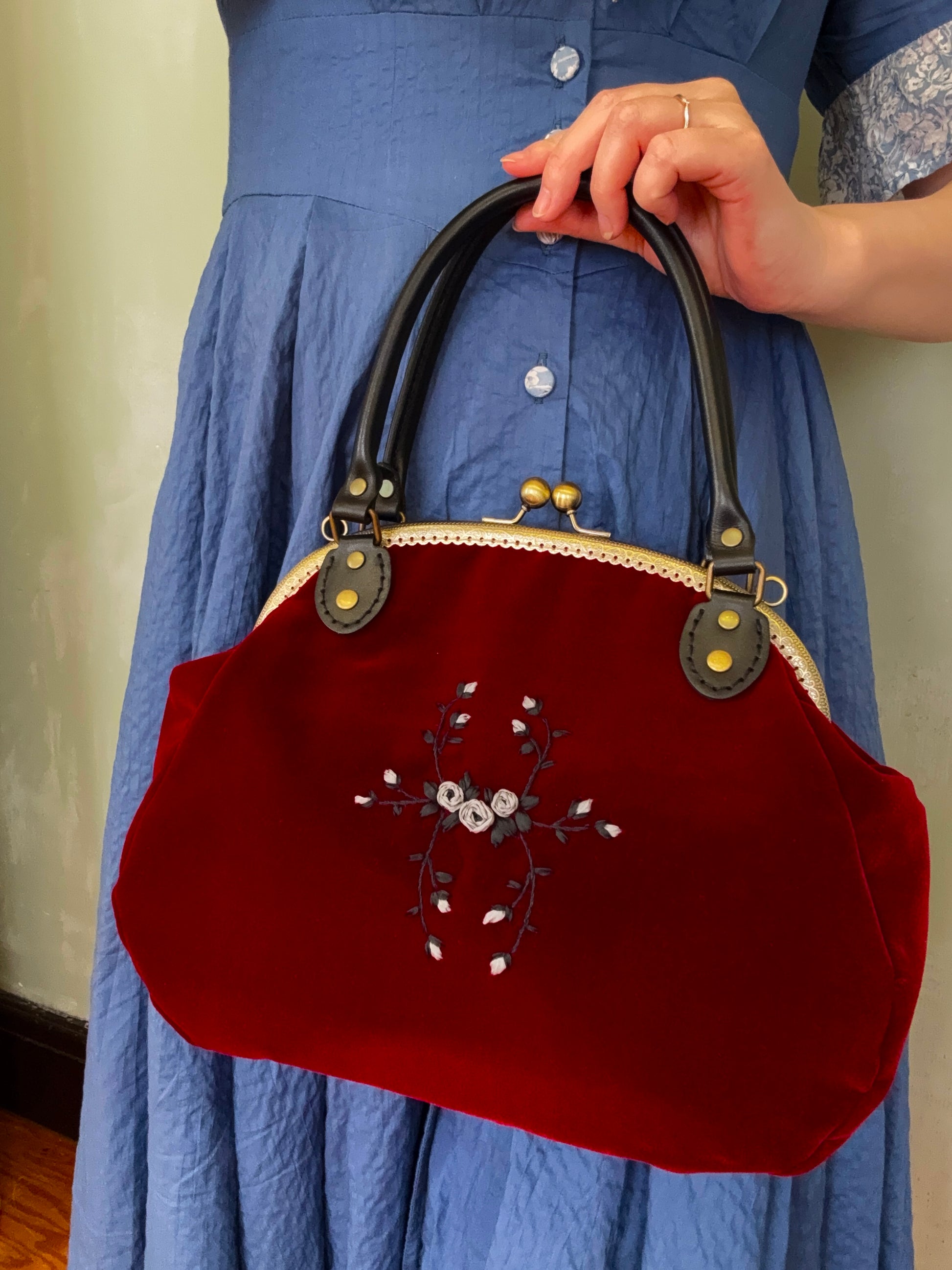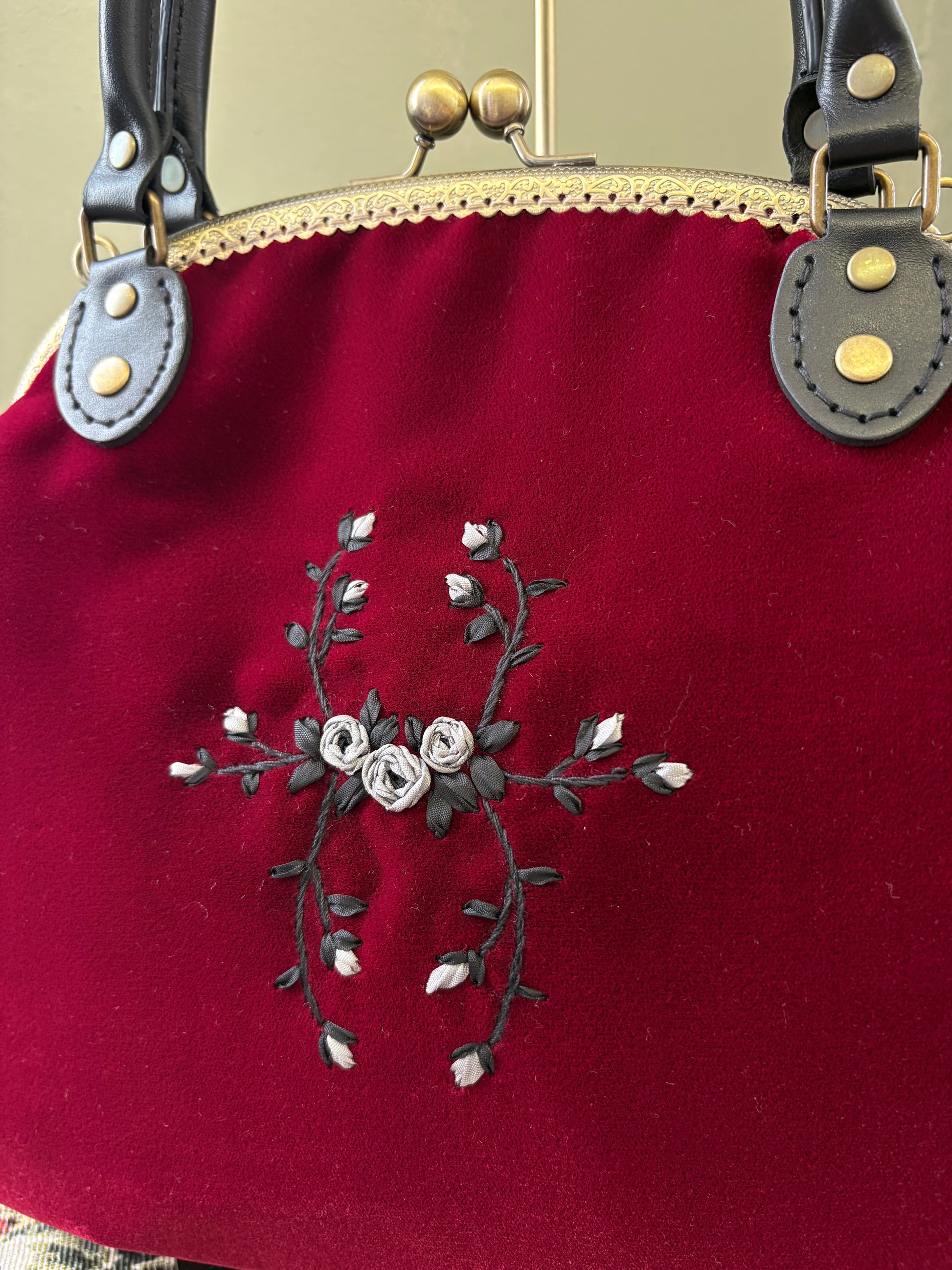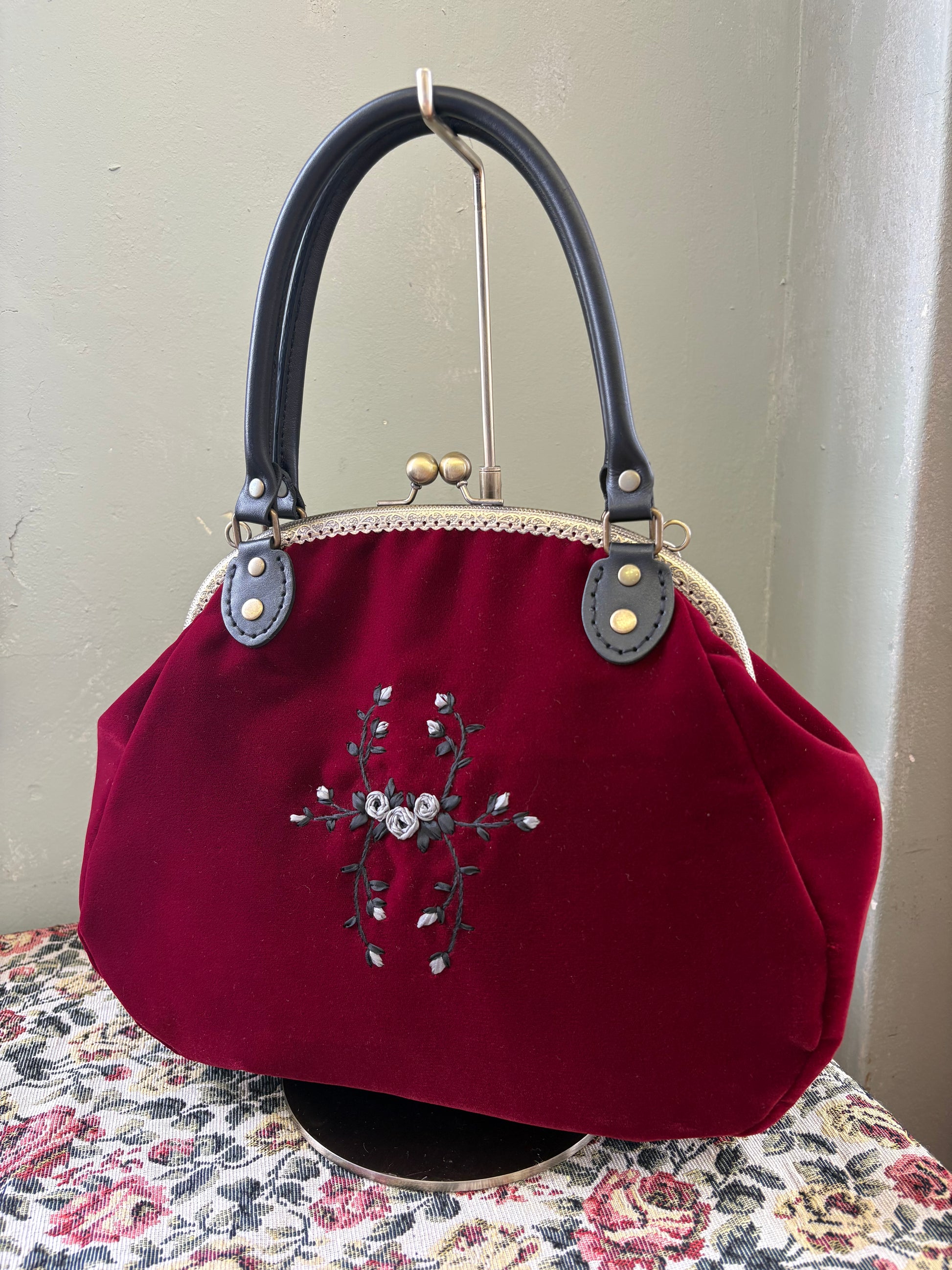 bordeaux グレーとブラックのローズがボルドーのベルベットにクラシカルなバッグ。※ボルドーのみ軽微な縫製不良あり。画像にてご確認をお願いいたします。