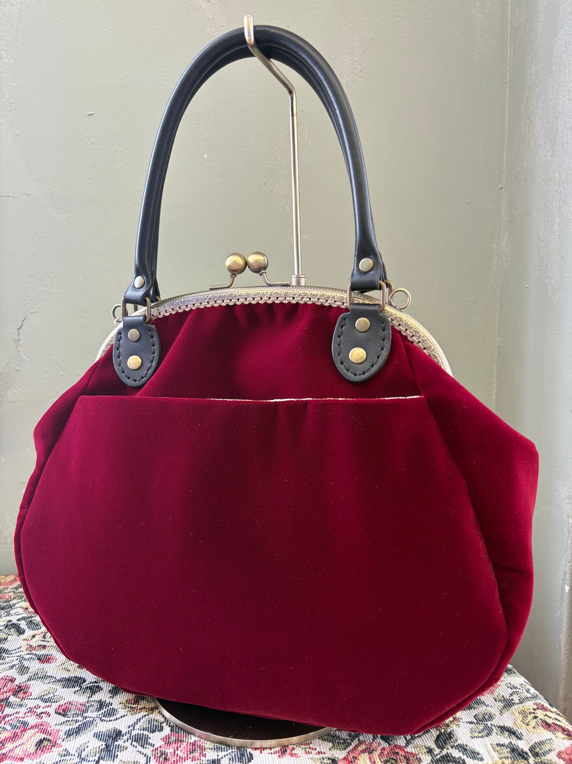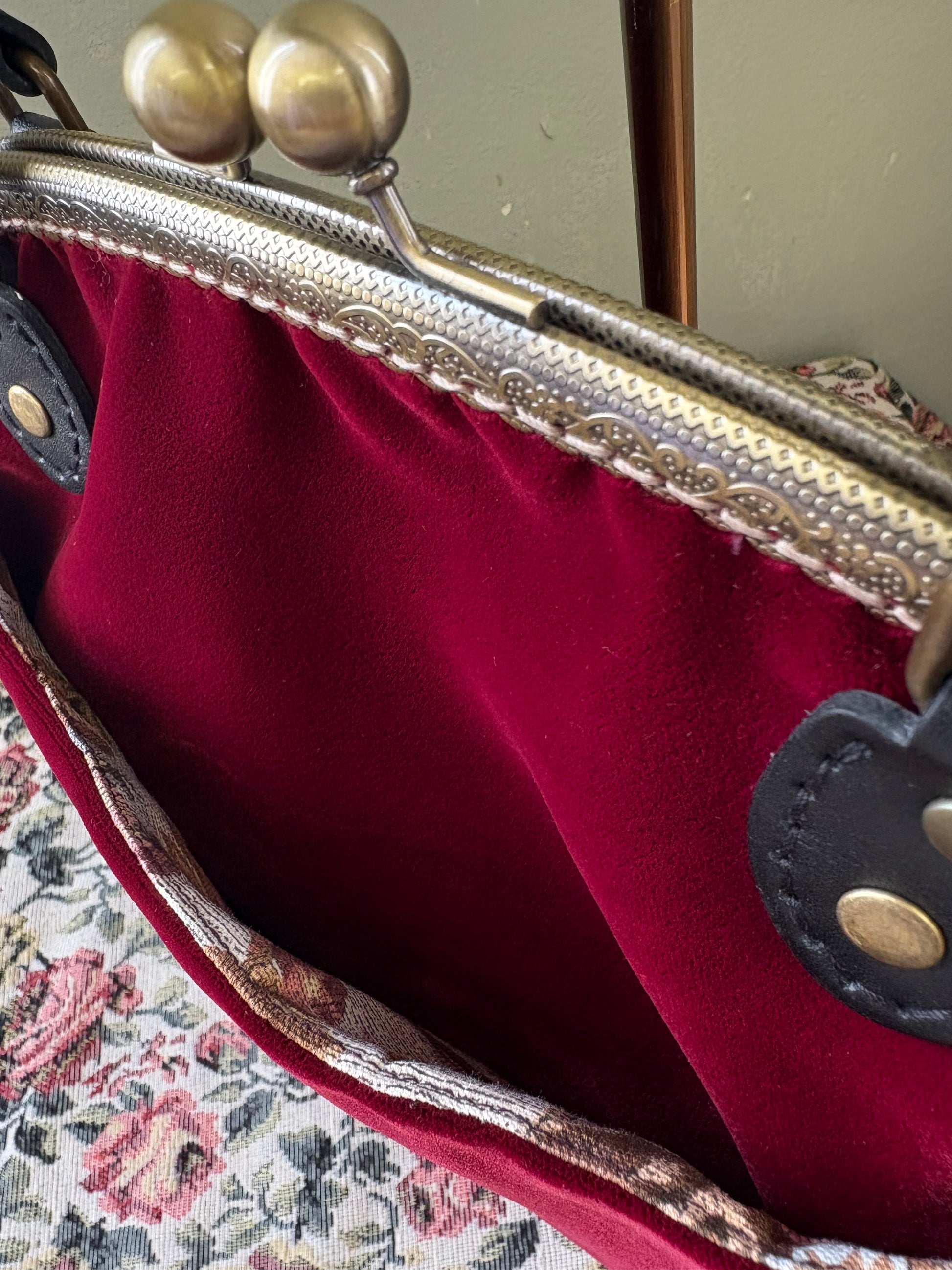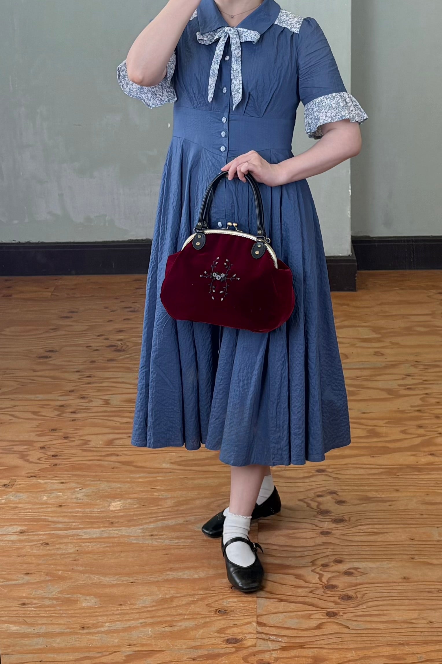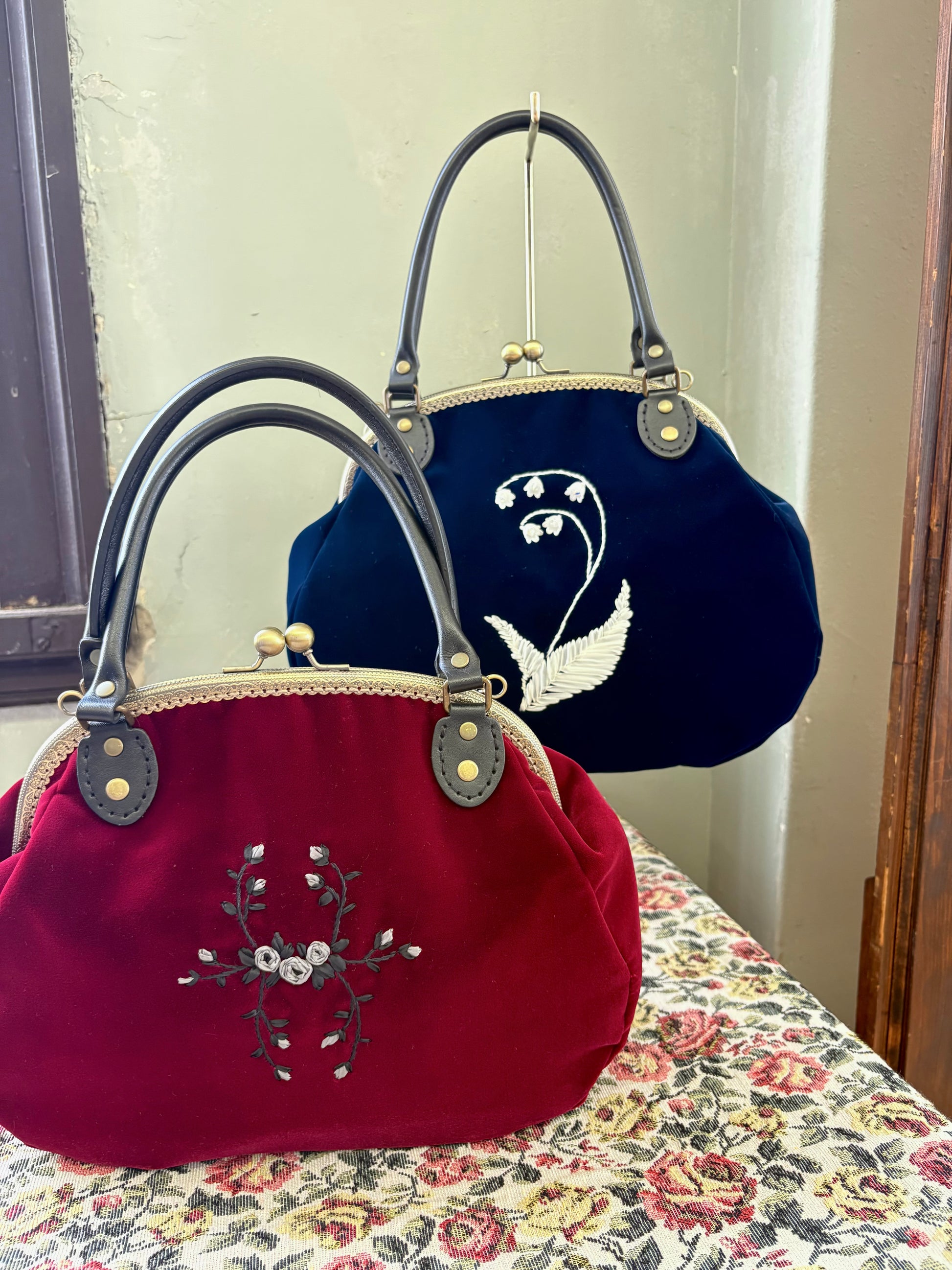 bordeaux グレーとブラックのローズがボルドーのベルベットにクラシカルなバッグ。※ボルドーのみ軽微な縫製不良あり。画像にてご確認をお願いいたします。